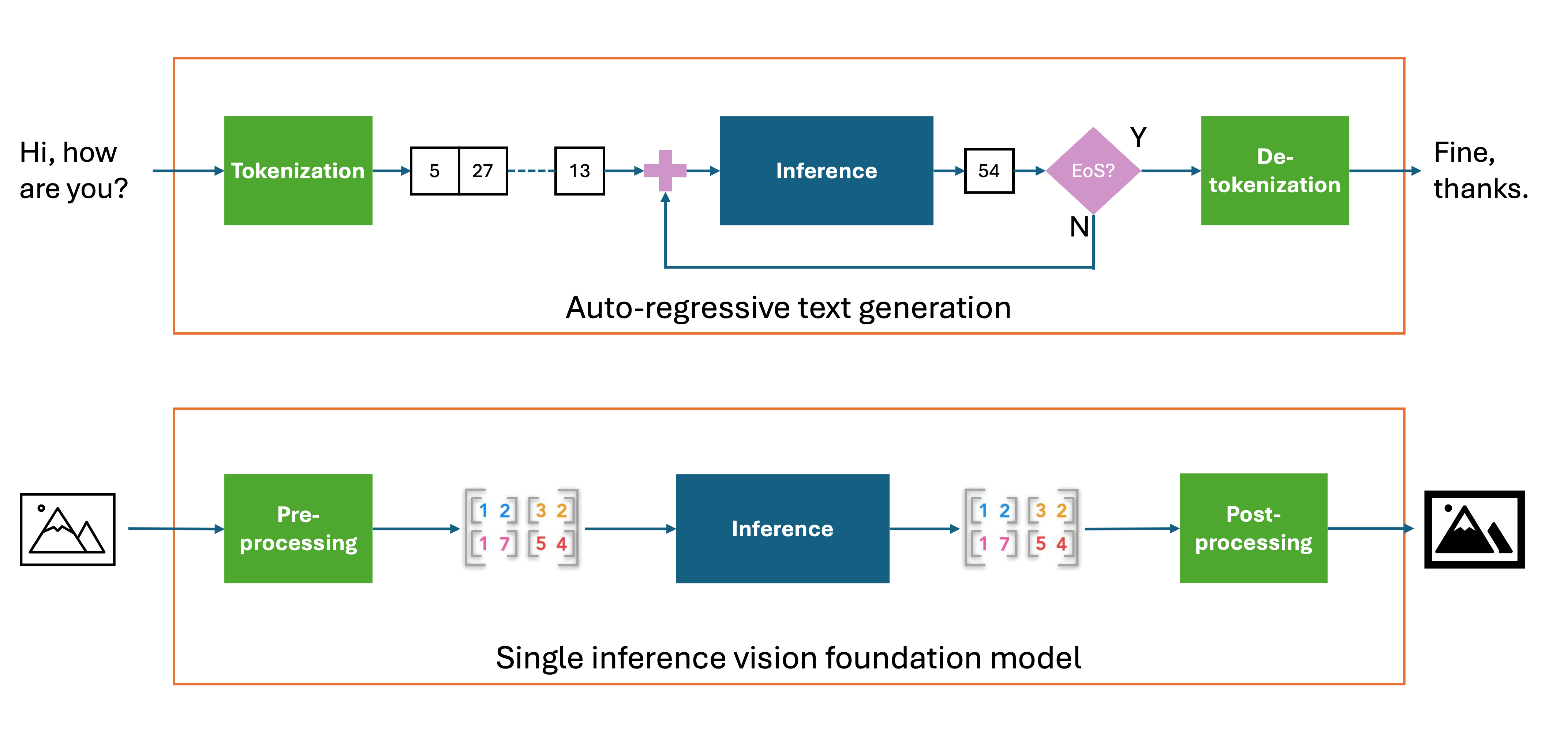 Unlike text models, geospatial foundation models (often implemented as vision transformers) don’t need token decoding, i.e., they do not need output tokens to be transformed into text. Instead, given one input image, a single inference generates the raw model output, and then this is post-processed into the output image. In addition, sometimes the input image needs to be partitioned and batched into a number of sub-images, or patches. These patches are then fed to the model for inference, with the resulting output images from each patch being stitched together to form the final output image.