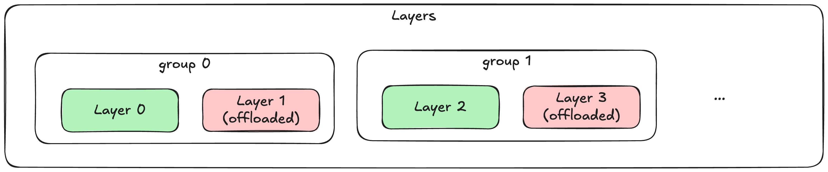 group_size: Group every N layers togethernum_in_group: Offload this many layers per group (last N of each group)prefetch_step: Number of layers to prefetch ahead