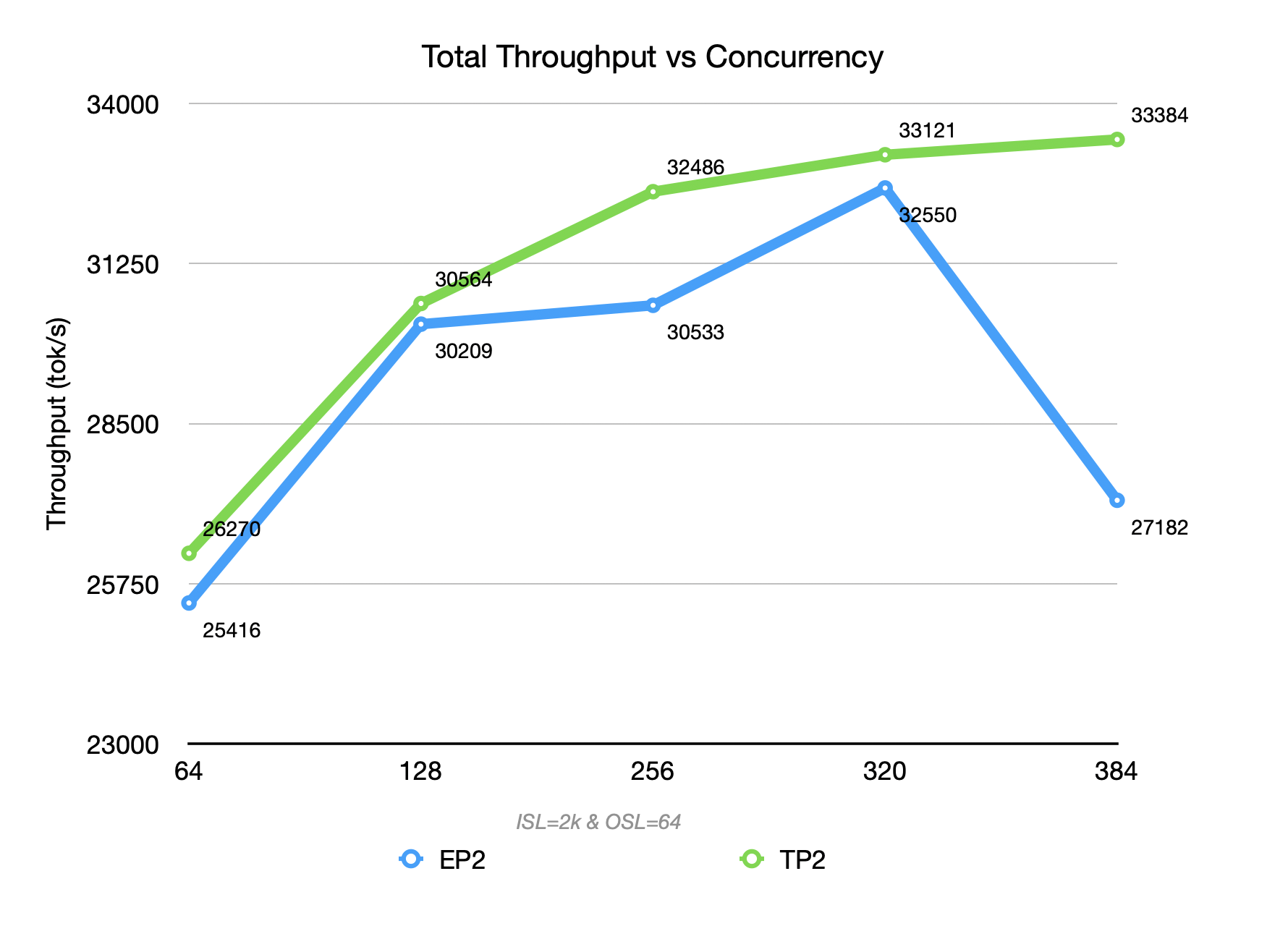 - DeepSeek V3.2 in EP2 is relatively weaker, with a Prefill peak throughput of ~ 7360 TGS.