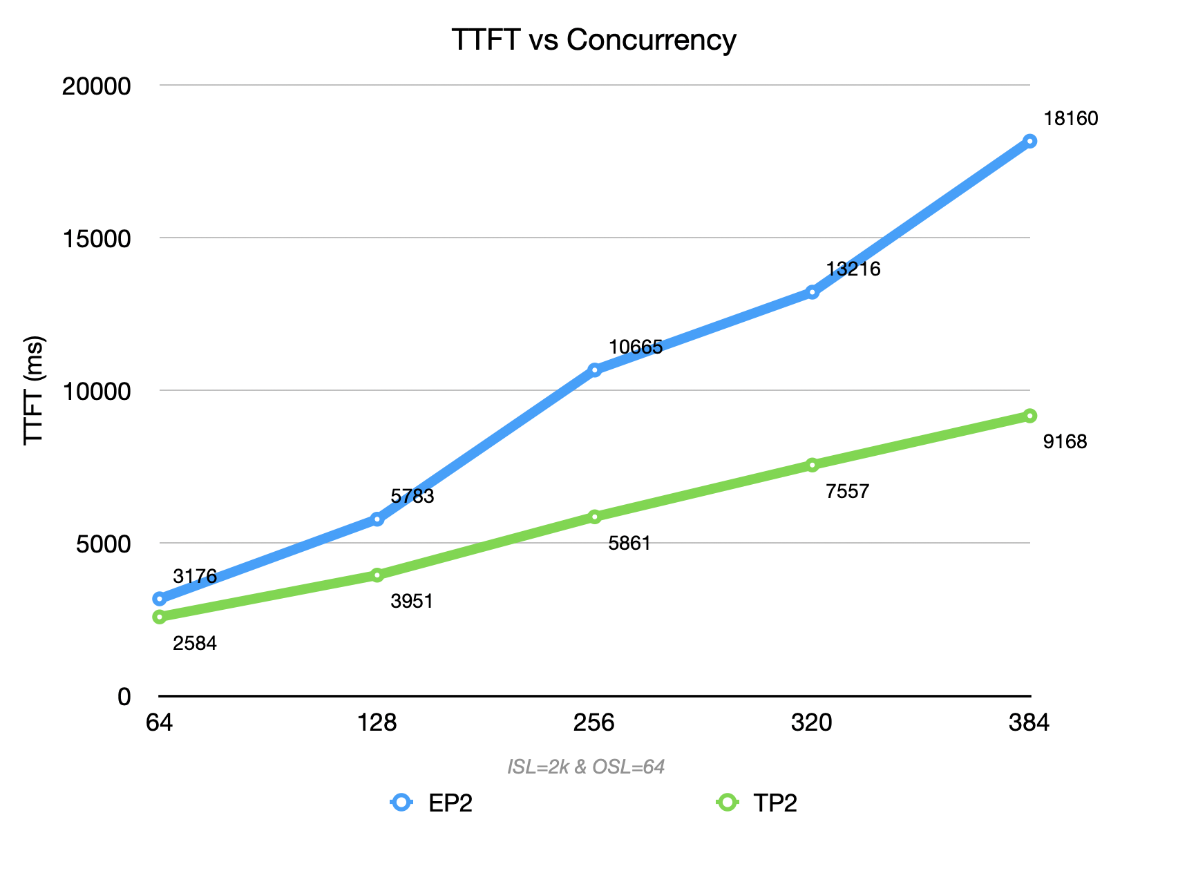 EP2 (blue curve) reaches a throughput ceiling of 22476 TGS, outperforming TP2 (green curve) in both throughput and the growth slope of TTFT. This benefits from EP's typical "large packet, low frequency" communication pattern, which better utilizes the high bandwidth of RDMA/NVLink under high concurrency.
