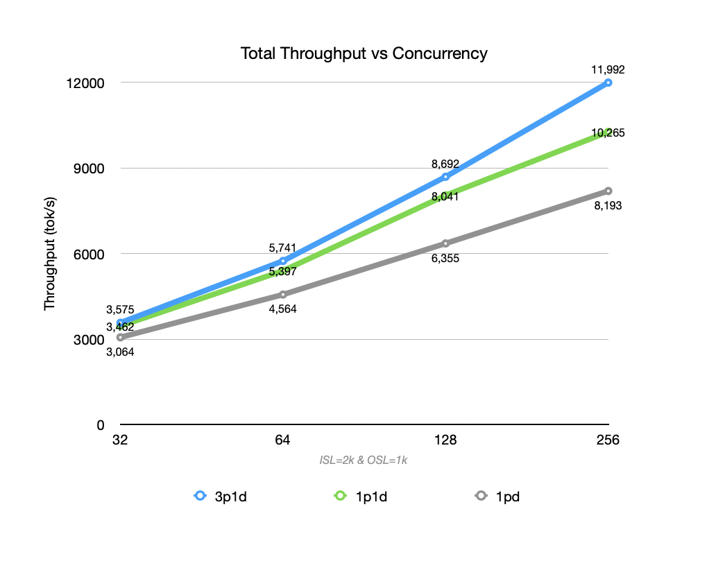 When ISL continues to grow (from 2K to 8K), the throughput of the 1P1D setup begins to struggle, with Prefill becoming the bottleneck. Requests wait in queue at the P node, unable to fully utilize the Decoder's compute power. When adding 2 P replicas (3P1D), they parallelize the Prefill phase of more requests, achieving better total throughput.