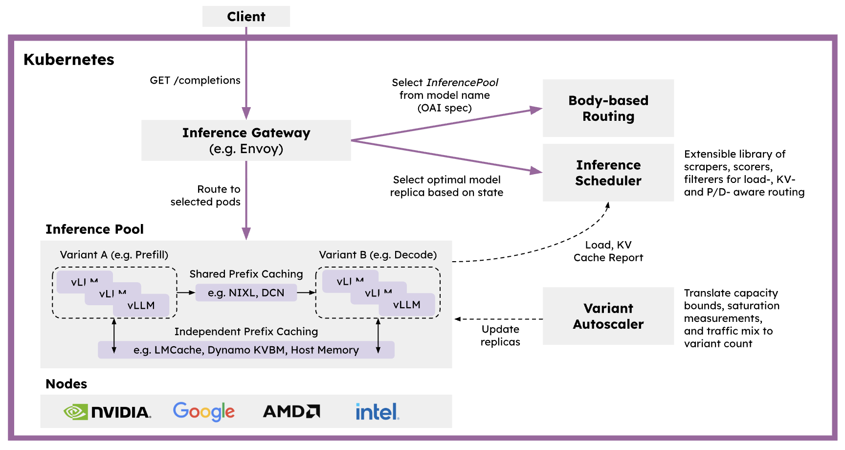 The framework integrates with NIXL and LMCache connectors for efficient KV transfer, and leverages Ray's distributed computing primitives to enable independent autoscaling of each phase based on load characteristics. Together, the solution provides a flexible and programmable layer for inference workloads that can be easily extended and composed to implement diverse serving patterns.